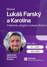 22.1. V 16:30 v kino Jitřenka, Beseda s Lukášem a Karolínou – o problematice závislosti na alkoholu a drogách Pořádá Jitro Café a kino Jitřenka. Vstupné dobrovolné. Na besedě se setkáte s Lukášem Farským, zakladatelem projektu JAS – Abstinenti Jablonec, který dlouhodobě natáčí rozhovory se záv...