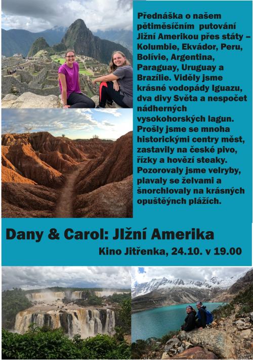 Přednáška o našem 5-měsíčním putování Jižní Amerikou přes státy – Kolumbie, Ekvádor, Peru, Bolívie, Argentina, Paraguay, Uruguay a Brazílie. Viděly jsme krásné vodopády Iguazu, dva divy Světa a nespočet nádherných vysokohorských lagun. Prošly jsme se mnoha historickými centry měst, zastavily na české pivo, řízky a hovězí steaky. Pozorovaly jsme velryby, plavaly se želvami a šnorchlovaly na krásných opuštěných plážích. Projely jsme největší solné pláně, ohřívaly se u gejzírů a okukovaly alpaky kolem nás. Vylezly jsme pár hor a dostaly se až do 5200 m.n.m.